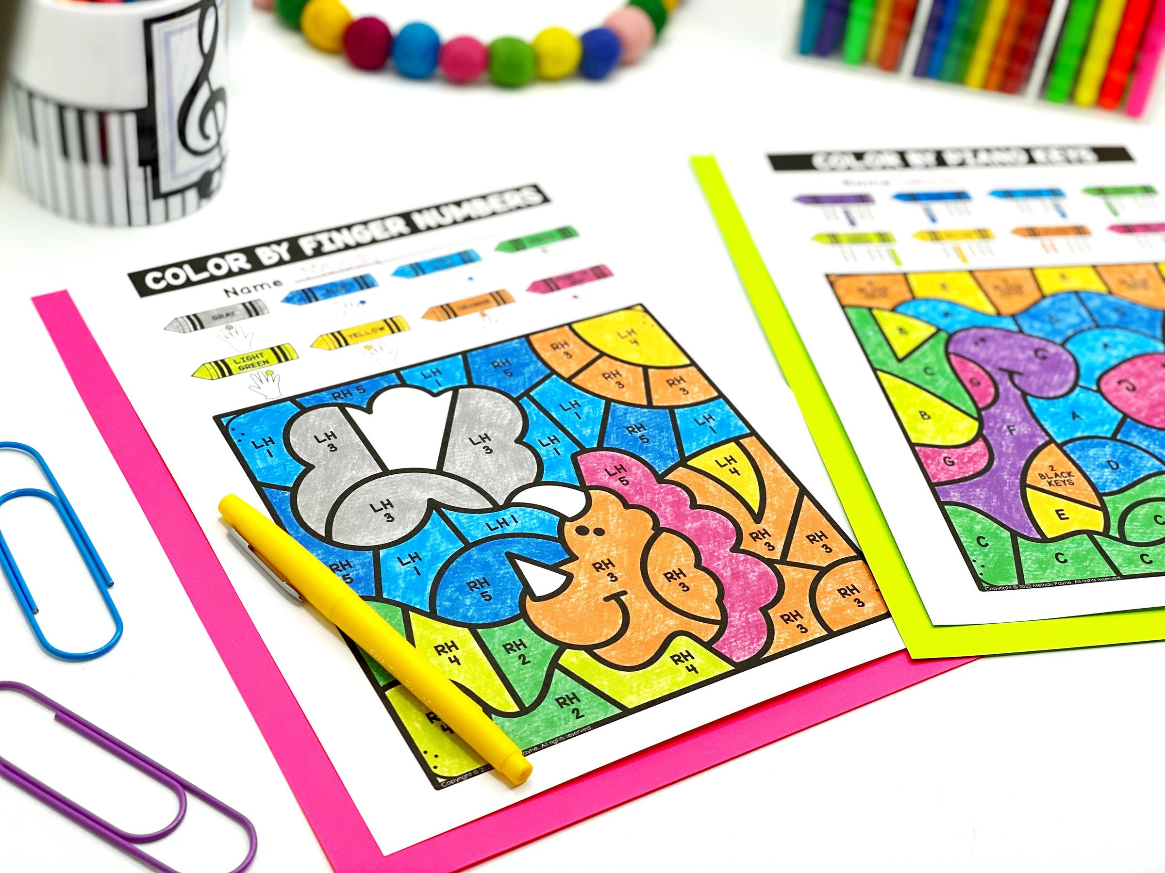 Review piano keys, finger numbers, and beginning music symbols with these irresistible beginning piano coloring pages!